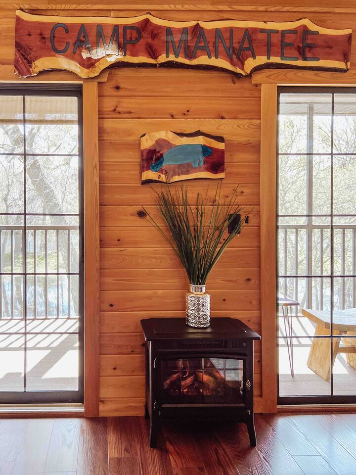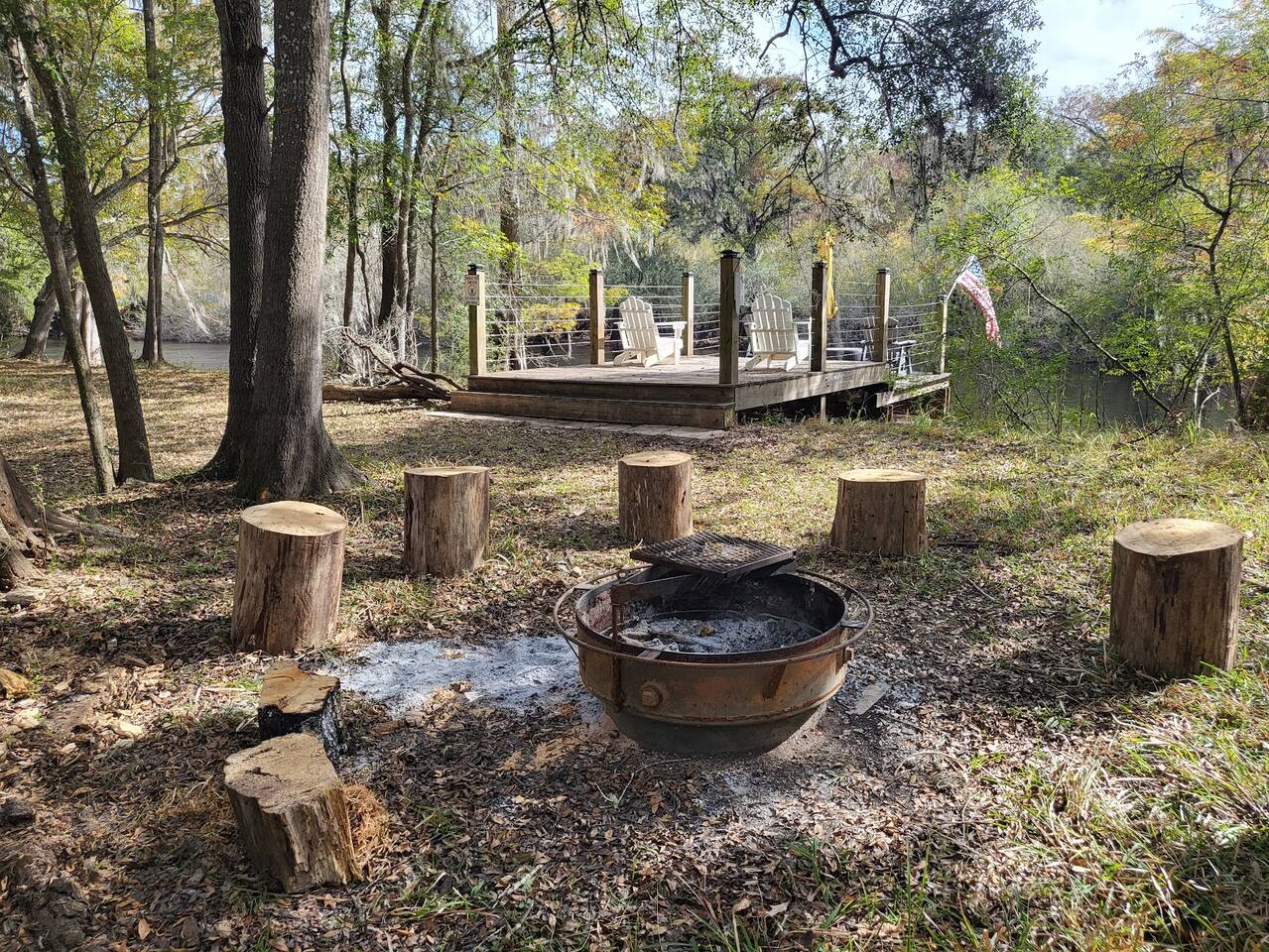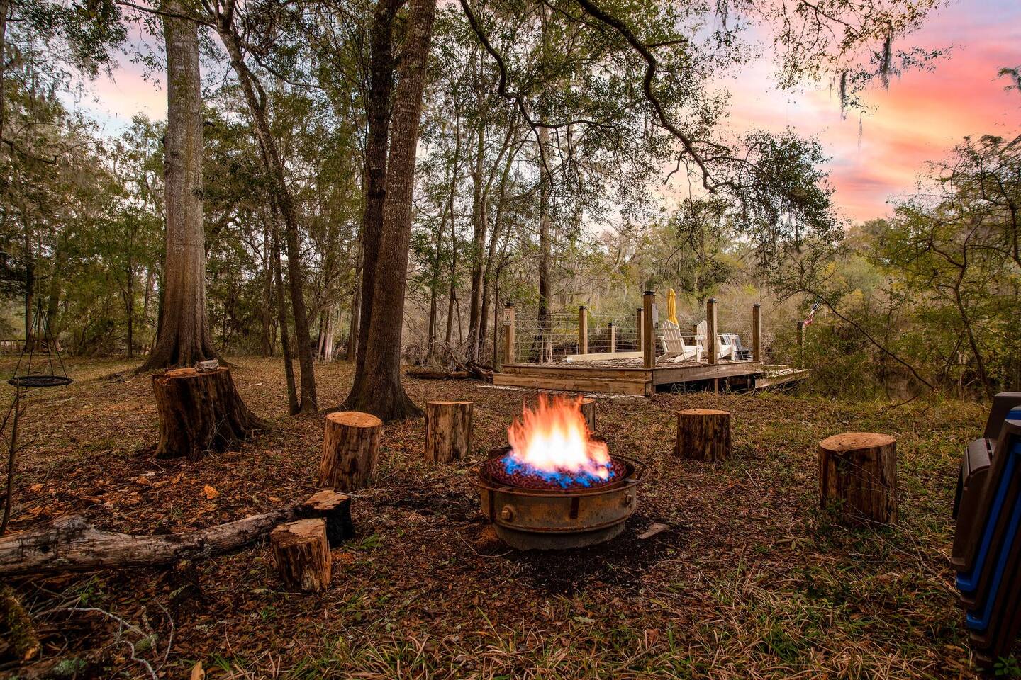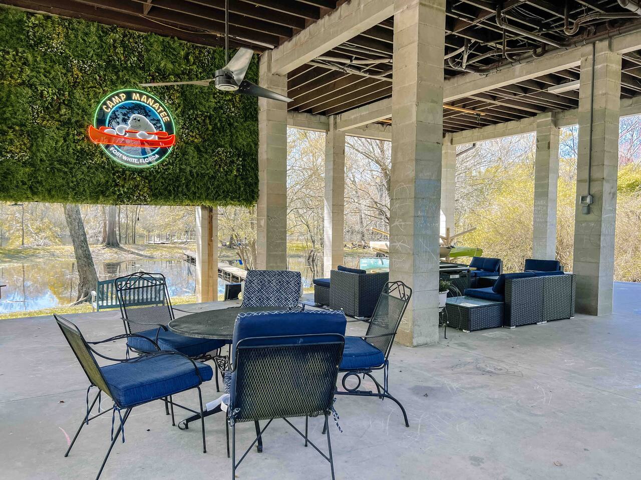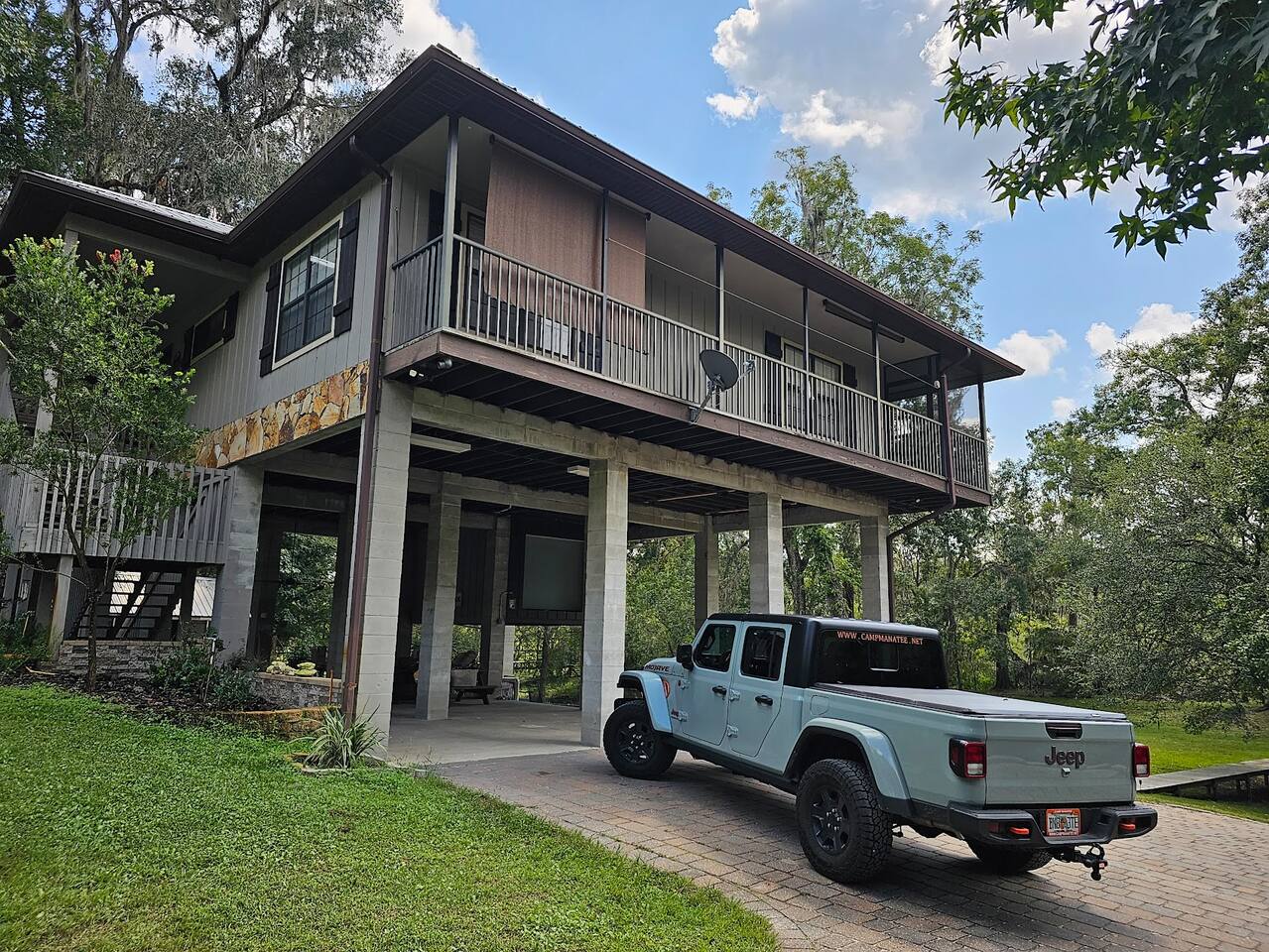 Camp Manatee is a stilt home with all the major indoor living areas upstairs (please note that you will need to climb up a flight of stairs to enter the house) There are three (3) spacious bedrooms, two (2) full bathrooms, and a fully equipped kitchen and dining table. The living area has comfortable leather couches with sliding glass doors across the entire river-facing wall. You are sure to catch some lovely river views along with a fully screened-in wraparound porch off the back of the home. There are four (4) TVs, all equipped with Roku streaming services for you to watch your favorite shows during your stay. Downstairs, there is an open-air recreation area with plenty of seating including a large lounge sectional plus table and chairs. There’s a hot tub, fire pit table, corn hole, and charcoal grill. Our property also features an additional 25 acres of vacant land adjacent to the property and just across the Santa Fe River is the Fort White Wildlife and Environmental Area that comprise another 1,600 acres of preserved lands. If you are looking to relax and get back in touch with nature, this is a must-visit spot for you!