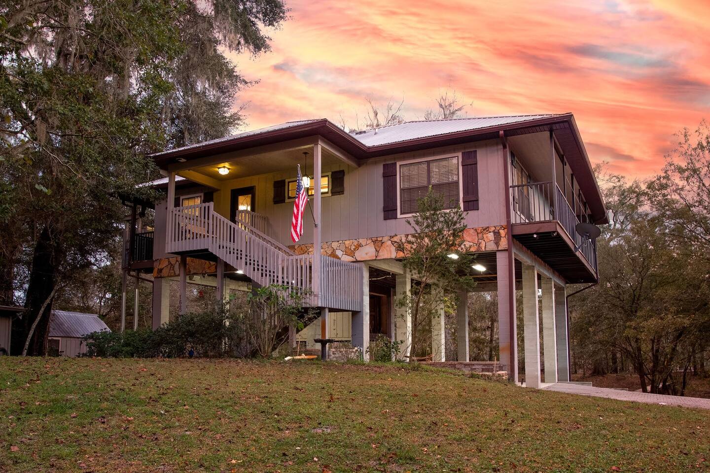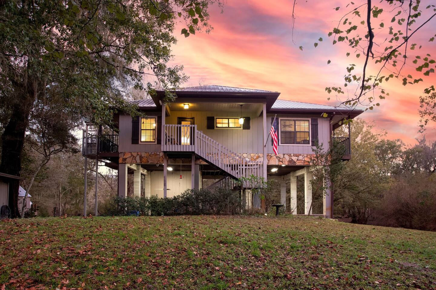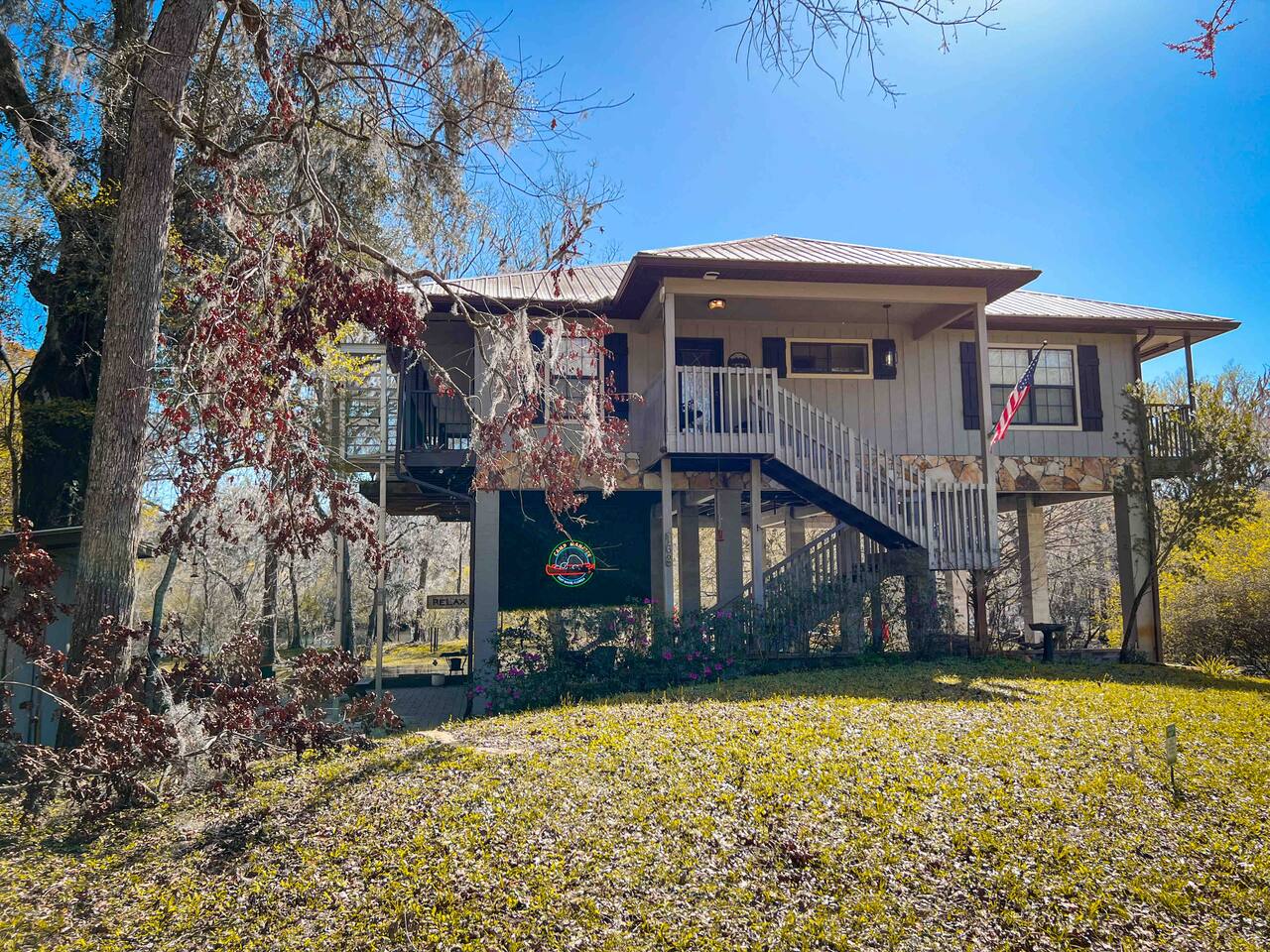 Camp Manatee is a magical estate situated on approximately 3 acres with over 650 feet of direct Santa Fe River frontage with a stilt home elevated over the ground by 30+ feet. This gives you an incredible vantage point of the expansive property from the home and wrap-around porches. The home is approximately 1,500 square feet with 3 bedrooms and 2 full bathrooms and sleeps (8) people comfortably. We offer complimentary kayaks for guests to use during their stay. Inquire about our boat rental!