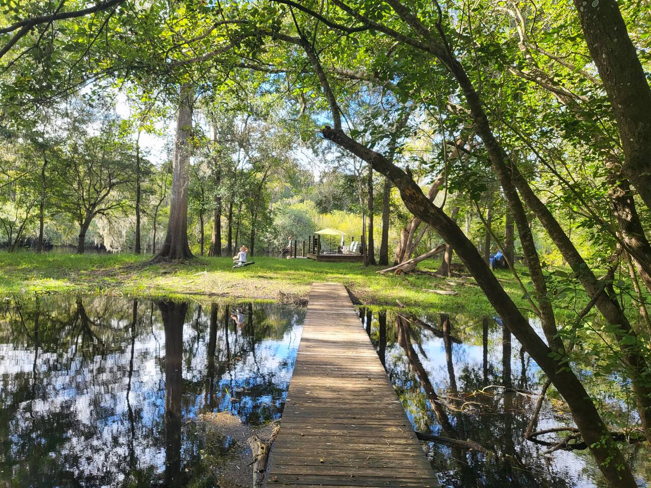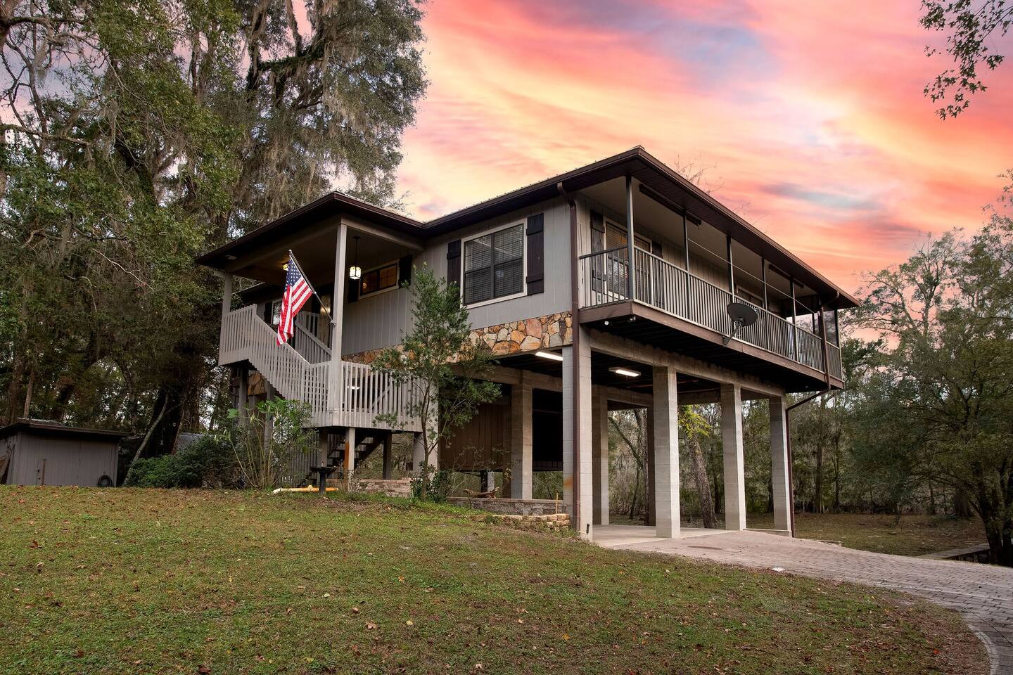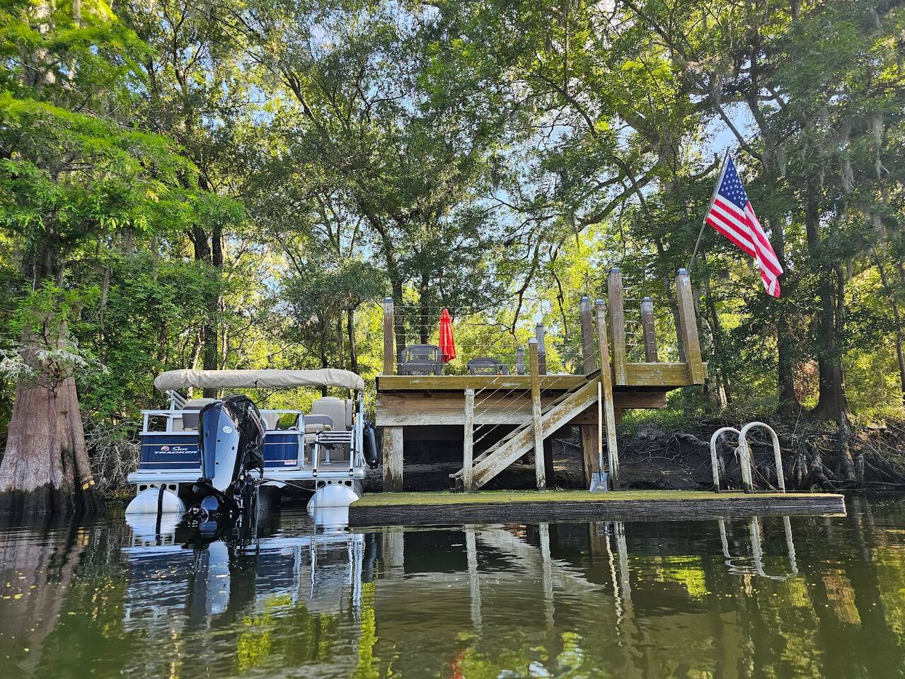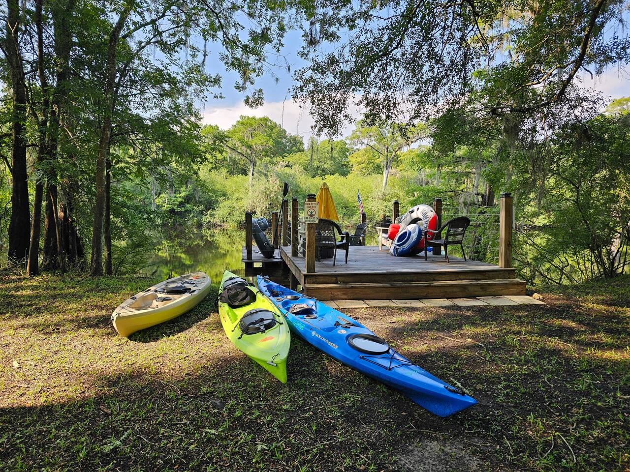 Camp Manatee is a magical estate situated on approximately 3 acres with over 650 feet of direct Santa Fe River frontage with a stilt home elevated over the ground by 30+ feet. This gives you an incredible vantage point of the expansive property from the home and wrap-around porches. The home is approximately 1,500 square feet with 3 bedrooms and 2 full bathrooms and sleeps (8) people comfortably. We offer complimentary kayaks for guests to use during their stay. Inquire about our boat rental!